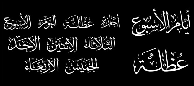 خط أيام الأسبوع والإجازة والعطلة .. خط من أعمال أخونا الغريب، يحتوي على مخطوطات أيام الأسبوع العربية والعطلة والإجازة، يمكن استخدامها في جميع الأعمال الفنية، وطريقة استخدامها بالأرقام، وهي متاحة للتجميل المجاني الان.